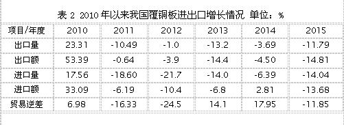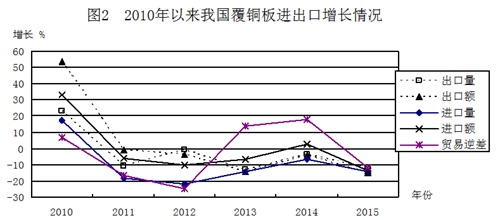 圖2和表2是2010年以來我覆銅板各年進(jìn)出口的增長情況。從2011年-2015年的“十二五”期間,各年的進(jìn)出口量、額,除2014年的進(jìn)口額出現(xiàn)一次微幅同比正增長外,其它年份的同比都處于負(fù)增長。貿(mào)易逆差在3.7~4.3億美元之間起伏變化。“十二五”期間我覆銅板的際貿(mào)易完全呈現(xiàn)出一種新的“常態(tài)”。