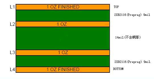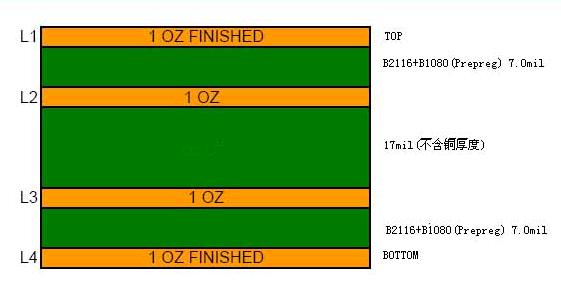 以下是我司生產(chǎn)的一種板件,該板的要求:4層板,完成板厚1.0±0.10mm,板材采用FR4,客戶有指定的疊層結(jié)構(gòu),見下圖