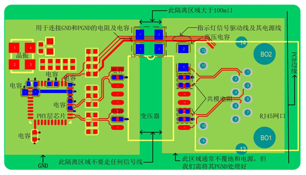 e) 變壓器的兩邊需要割地:即RJ45連接座和變壓器的次級線圈用單獨的隔離地,隔離區域100mil以上,且在這個隔離區域下沒有電源和地層存在。這樣做分割處理,就是為了達到初、次級的隔離,控制源端的干擾通過參考平面耦合到次級;
