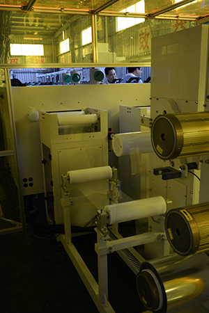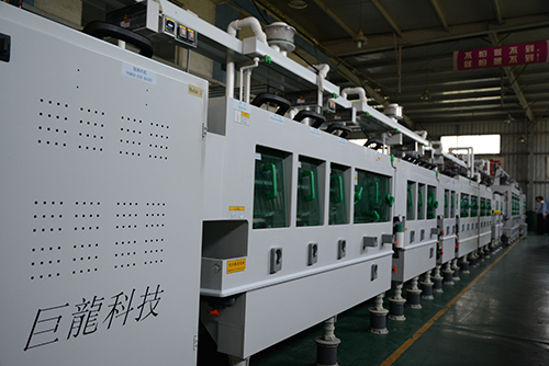 在閆董的帶領(lǐng)陪同下,GPCA/SPCA一行參觀了巨龍自主研發(fā)制造的RTR/DES生產(chǎn)線。據(jù)介紹,RTR/DES生產(chǎn)線的大特點在于卷對卷、水平雙工位作業(yè),該DES線的過板能力薄0.036mm,板寬度為250mm,同時能生產(chǎn)兩種不同規(guī)格的產(chǎn)品,大大提升了生產(chǎn)效率;同時,此DES線還配置了真空蝕刻工藝,有效防止“水池效應(yīng)”、提高蝕刻均勻性,目前在片對片實驗中極差值已達(dá)到了94%以上,量產(chǎn)可達(dá)到40um/40um。該DES線不僅節(jié)省了勞動成本、提高了整體的生產(chǎn)效率,還有效保證軟板的品質(zhì),使軟板生產(chǎn)技術(shù)更上一個臺階。